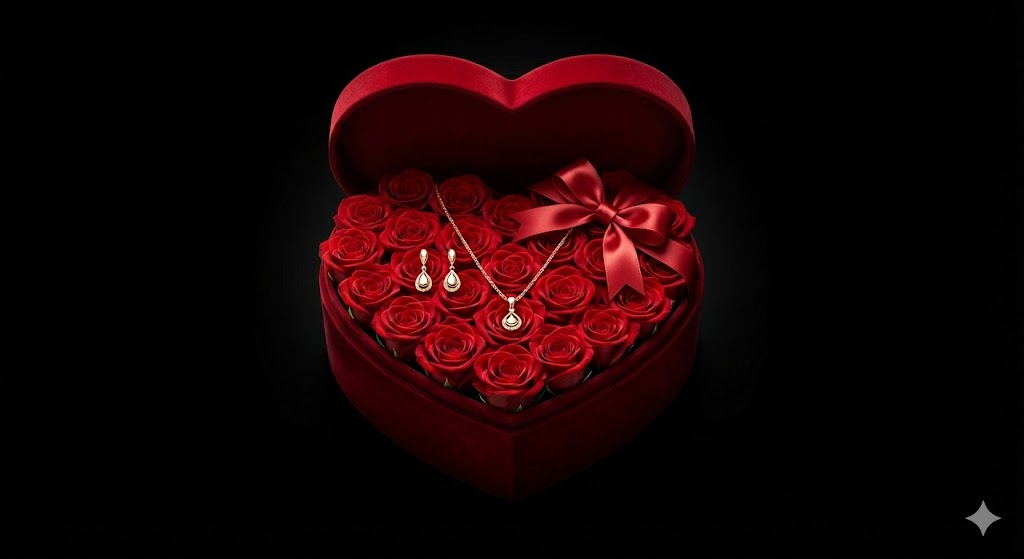 Floweraura Sparkling Love Adornments Jewelry & Artificial Flower in Heart Red Box Valentine's Gift